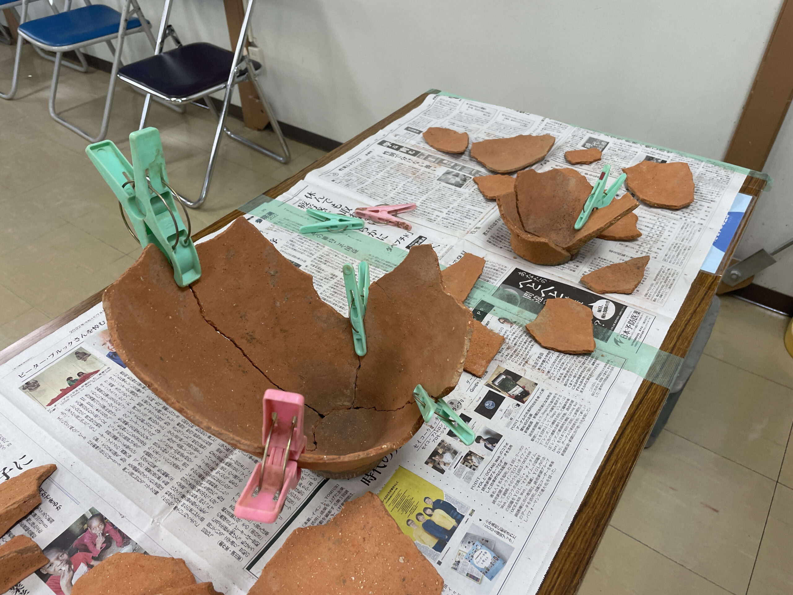 (3)「復元」:レプリカ土器の破片をつなぎ合わせ元の形に復元します。