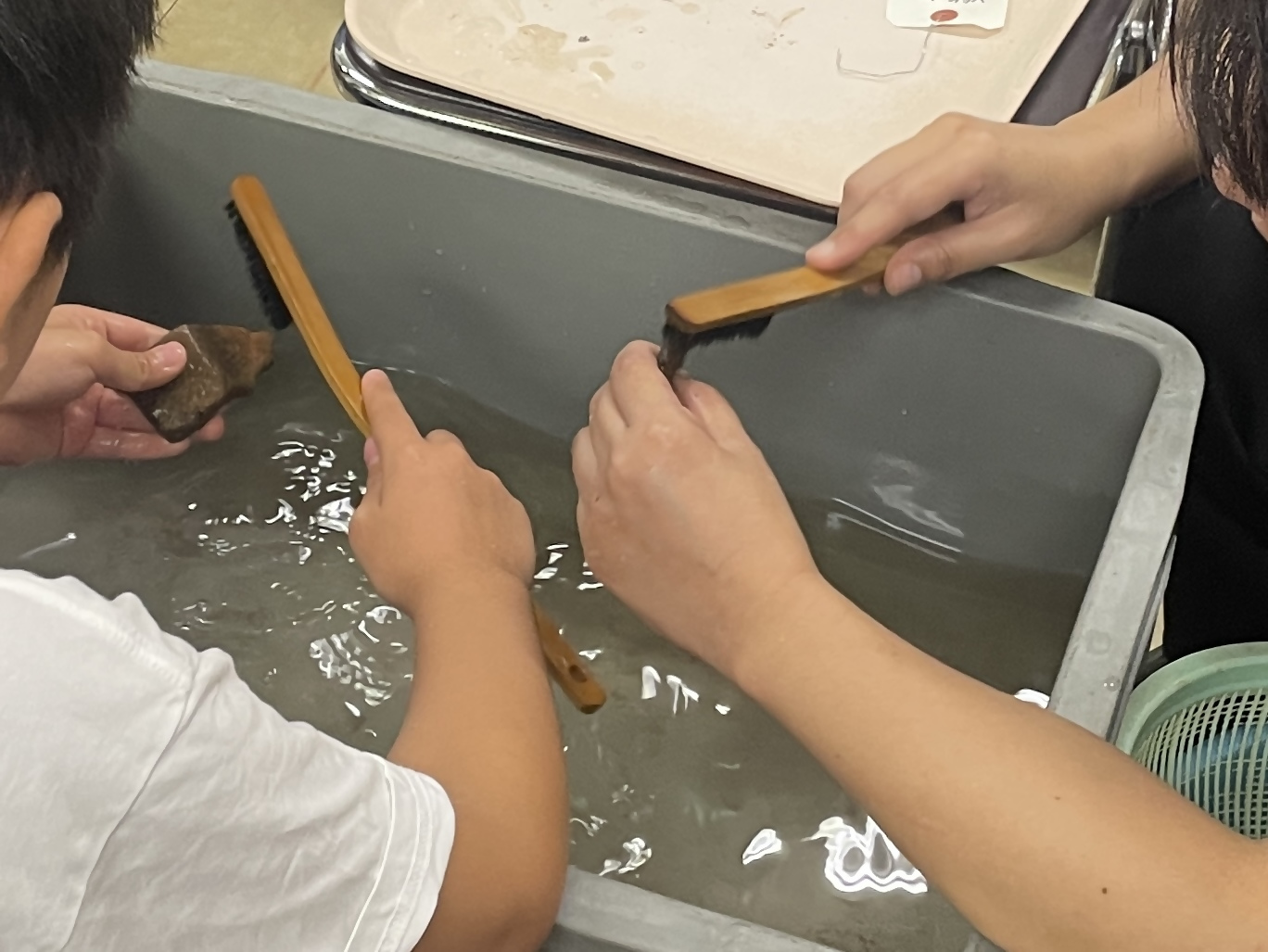 (1)「水洗い」:本物の遺物をブラシなどを使って丁寧に水洗いします。